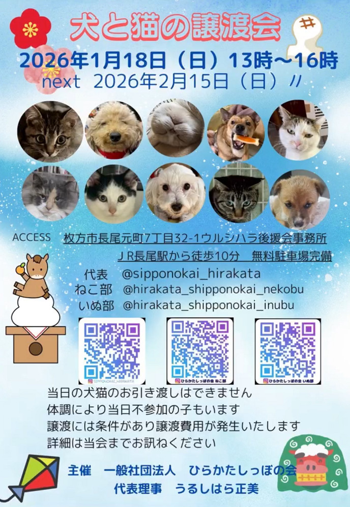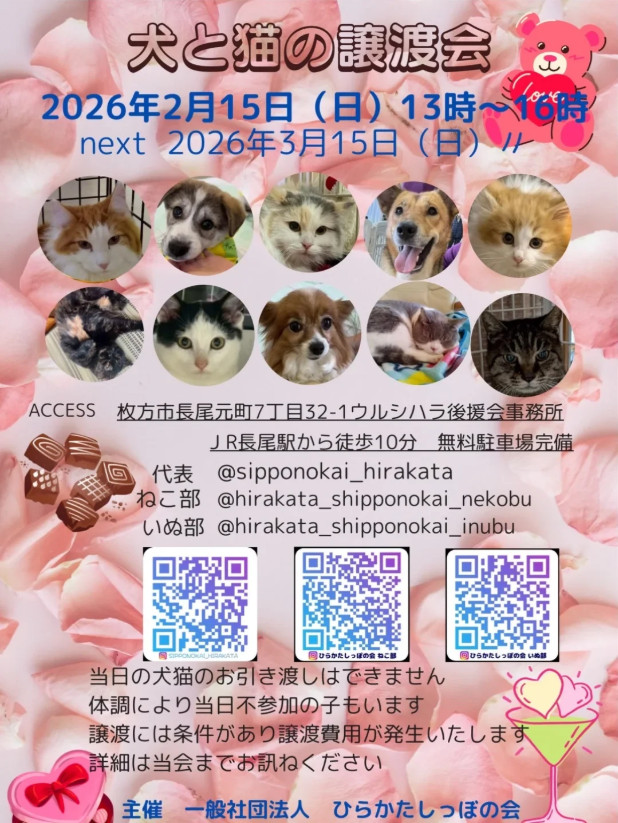 大阪府枚方市(ひらかた)で猫と犬の保護活動とTNRをしております。 「一般社団法人 ひらかたしっぽの会」は、殺処分ゼロを目指す公益財団法人どうぶつ基金の協働ボランティアです。どうぶつ基金が発行する「さくらねこTNR無料不妊手術チケット」を利用してTNRを行っており、チケットを使用して行った不妊手術費用については全額どうぶつ基金が負担します。